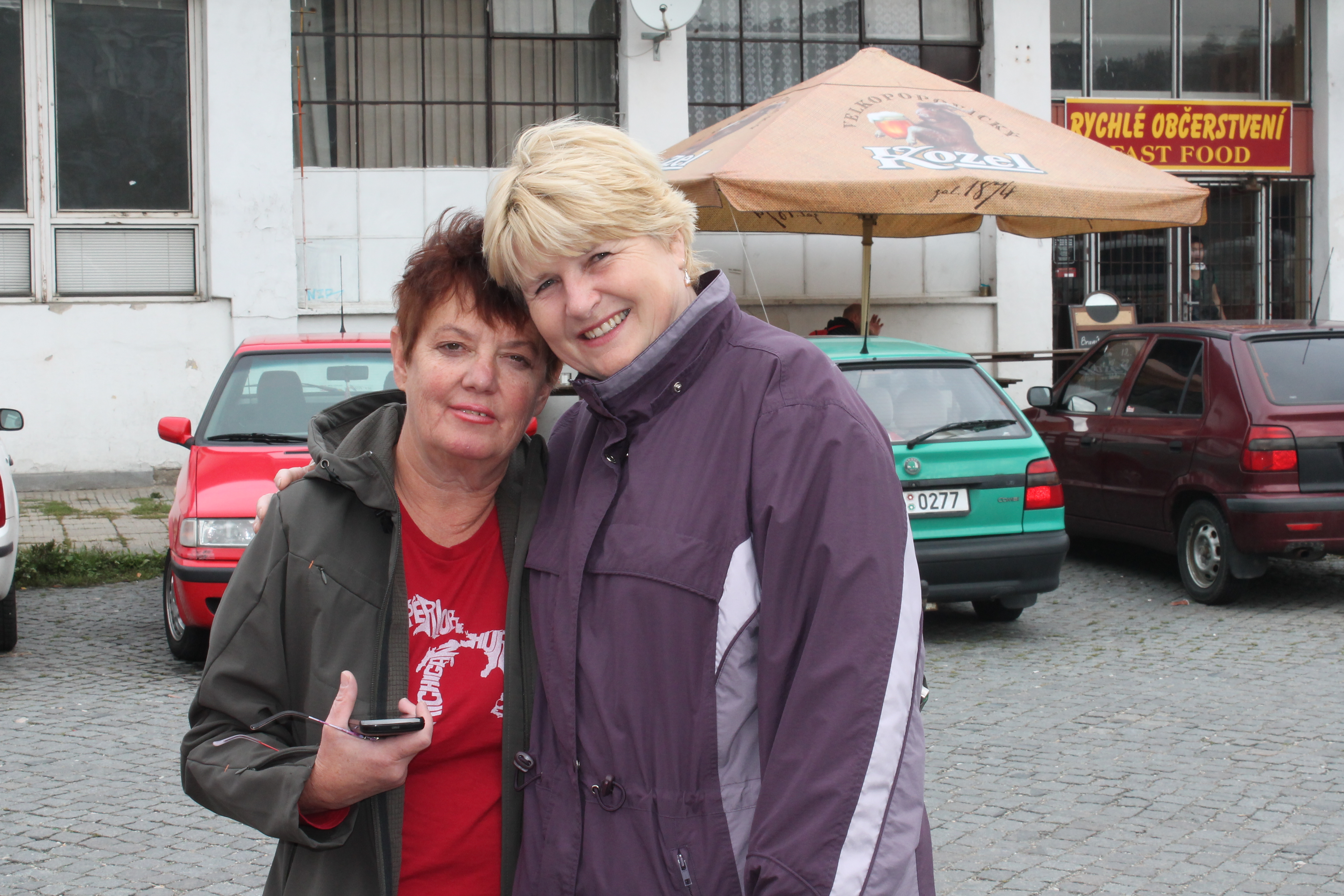 Emma Palova with longtime friend Liba Hlavenka in front of train station Zlin.
